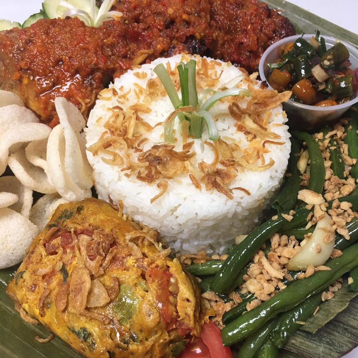 (nasi uduk, ikan sambal pete, sambal udang kentang, buncis tahu, telor balado, timun)